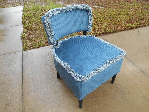An older Pier1 Imports chair that is very sturdy, comfortable, and apartment size. The soft blue corduroy fabric with multicolored brush fringe is very trendy. $230 |