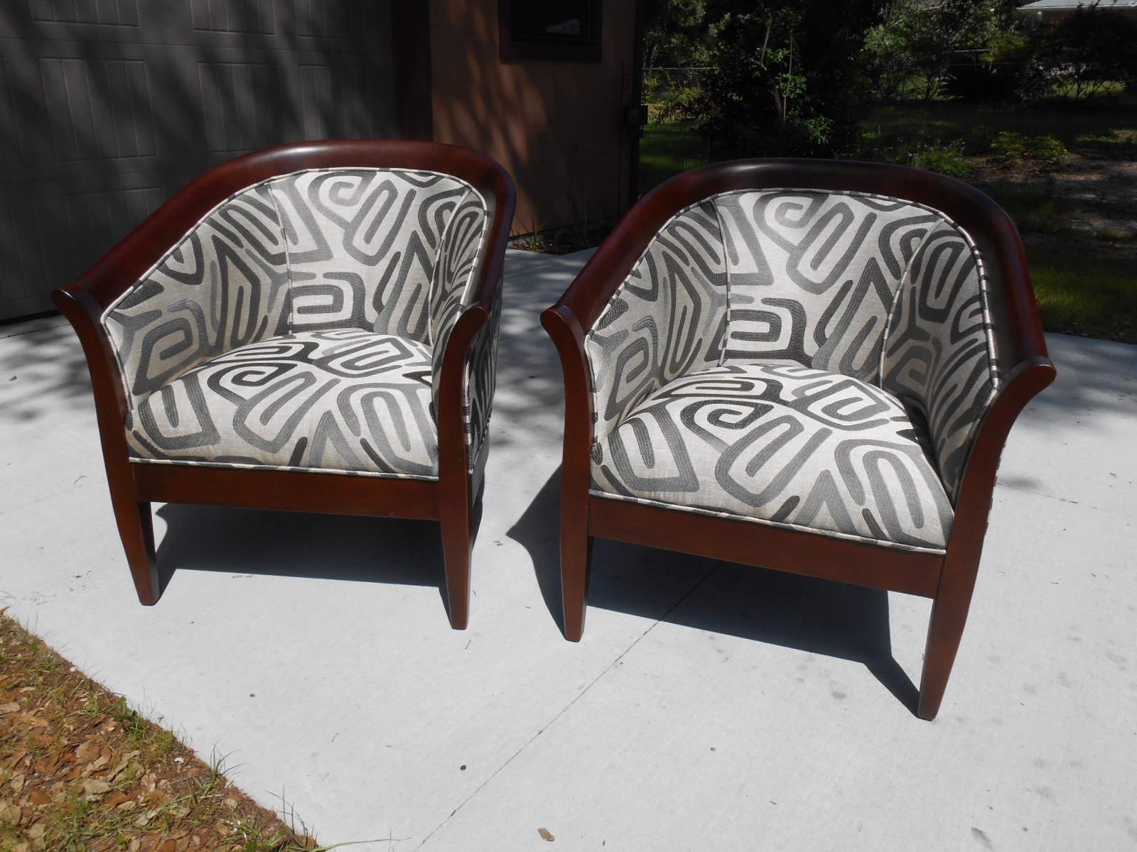 | MID CENTURY BARREL CHAIRS IN MODERN GEOMETRIC PRINT |